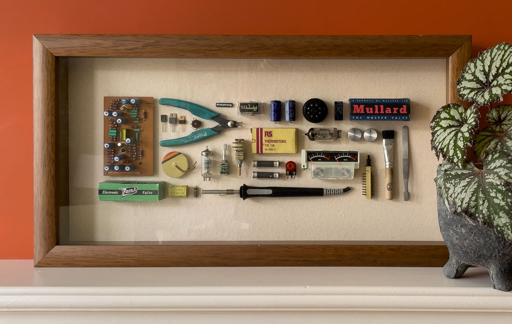 Rectangular walnut-framed Memory Box containing a collection of vintage audio parts and repair-shop tools celebrating the history of East London electronics workshop, Armstrong Audio.