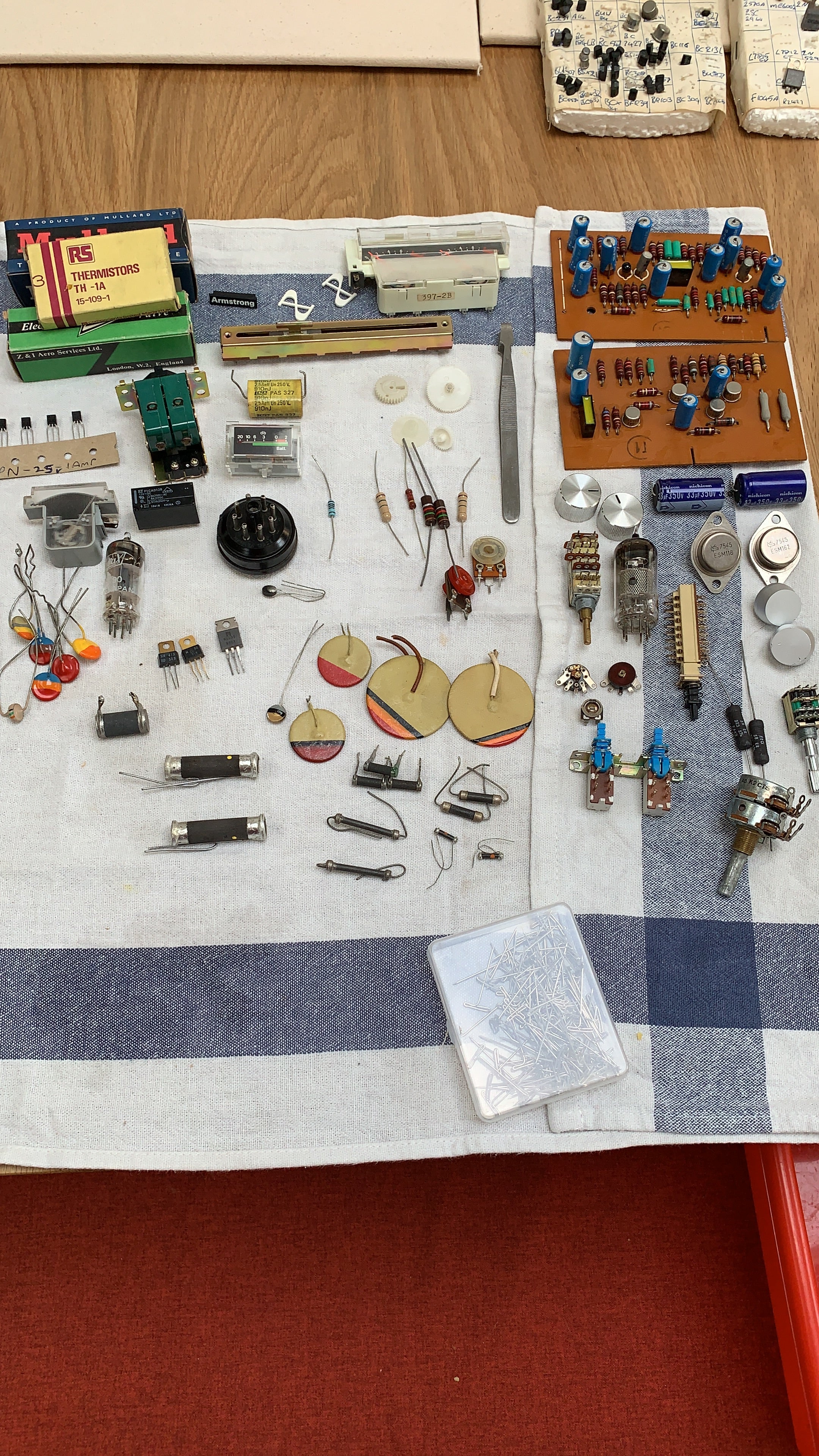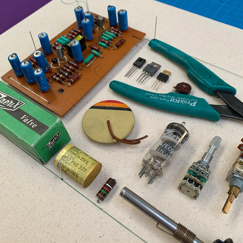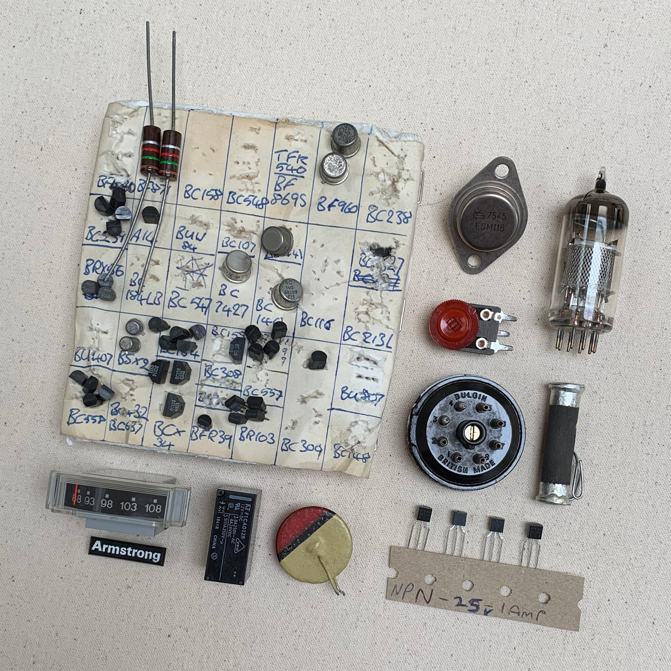 I showed one of my Curious Collections to Shamil and asked whether he would be interested in collaborating in creating a special vintage audio parts and tools Memory Box. To my delight he was really keen, so we arranged a time for me to come to the workshop and go through all their drawers of vintage parts and take what I thought would work well in the collection. It was an absolute dream project. I loved all the boxes the dials and valves came in, which were so colourful and with such striking typography.