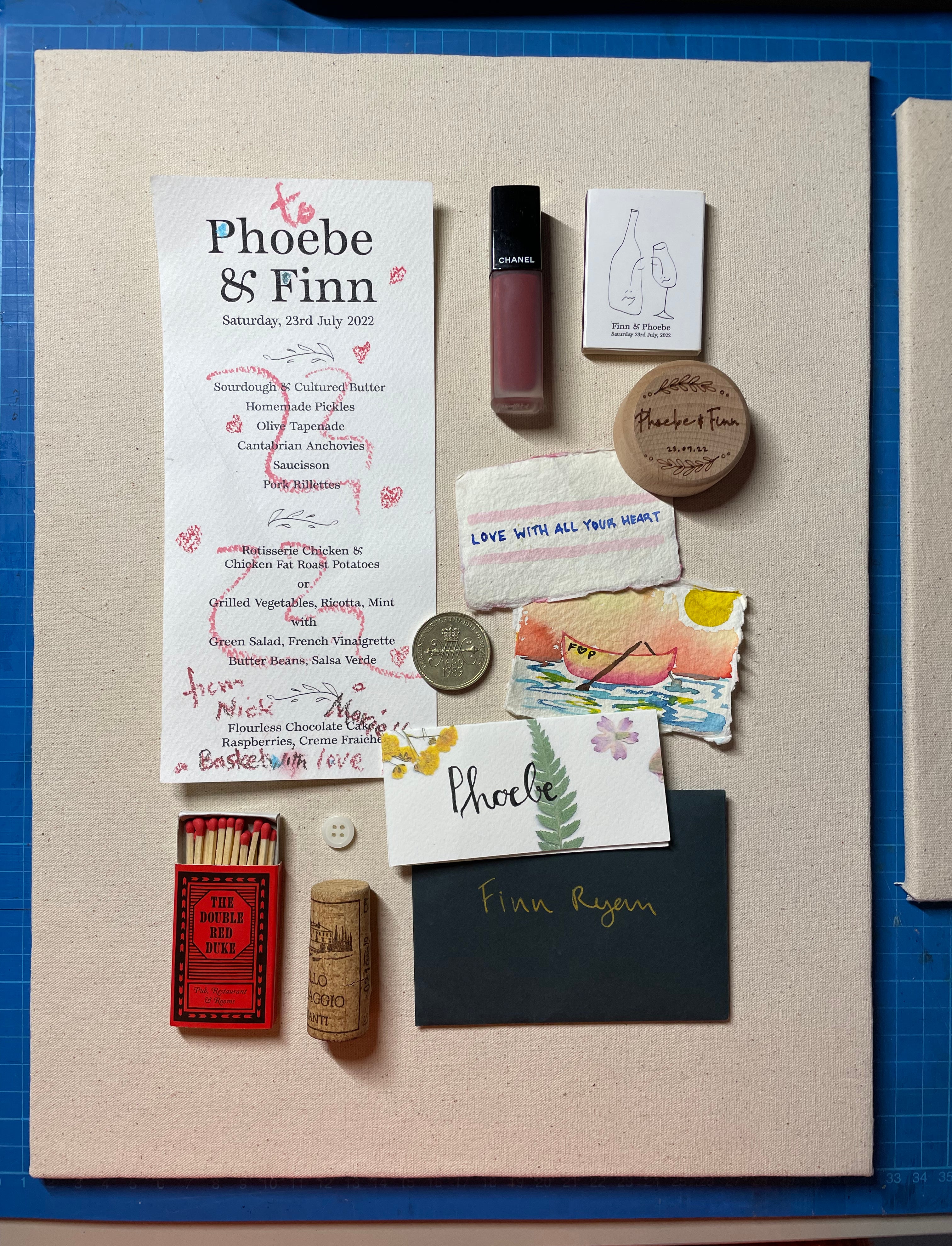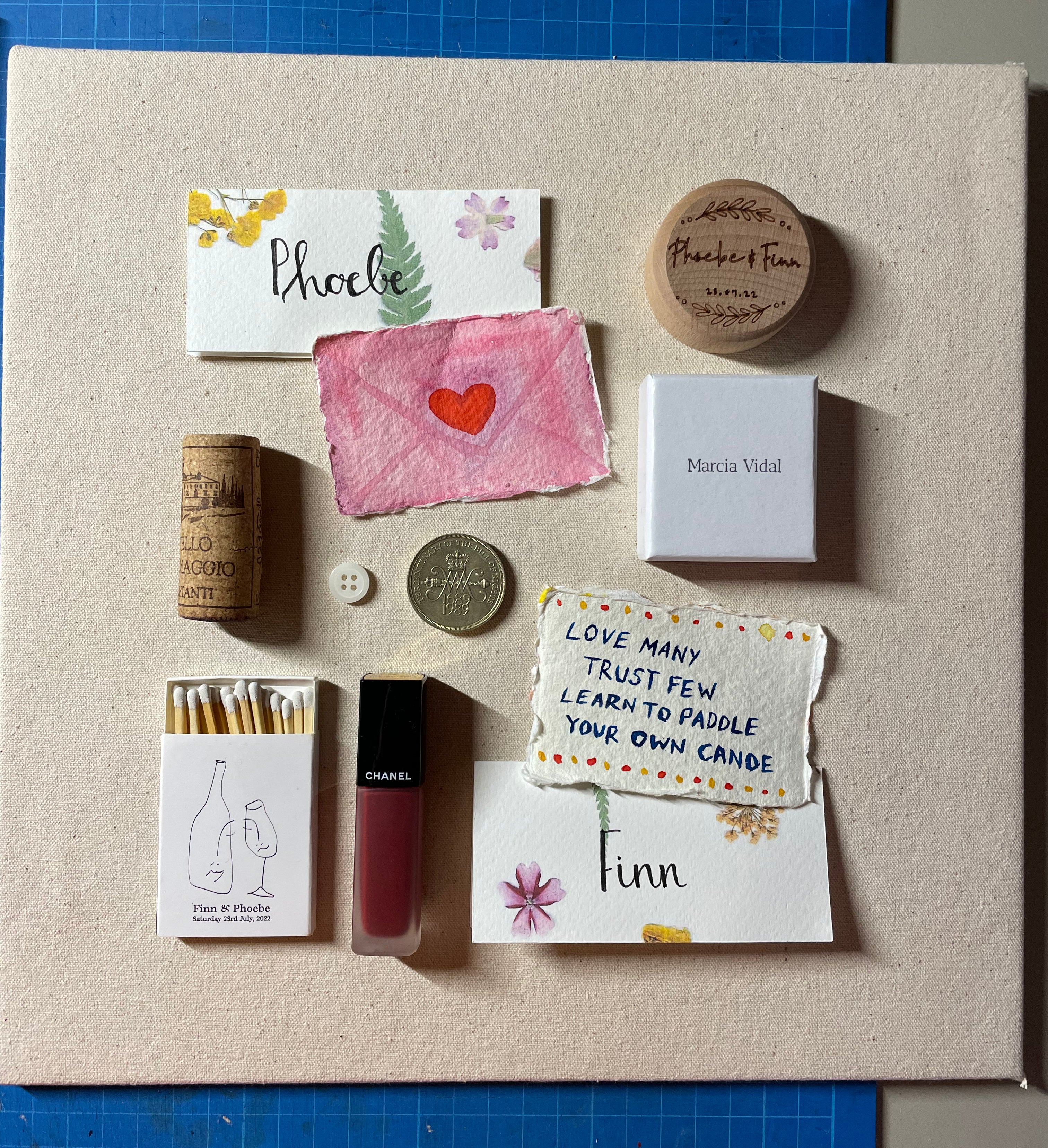 One common challenge with wedding keepsakes is the abundance of paper goods –stationery, place settings and comment cards – that can be quite large and visually dominant. This was the case for Finn and Phoebe, whose wedding invitation was too big to include. Luckily, the design had also been used on a smaller matchbox, which became a perfect nod to their stationery while maintaining the compact format they desired.